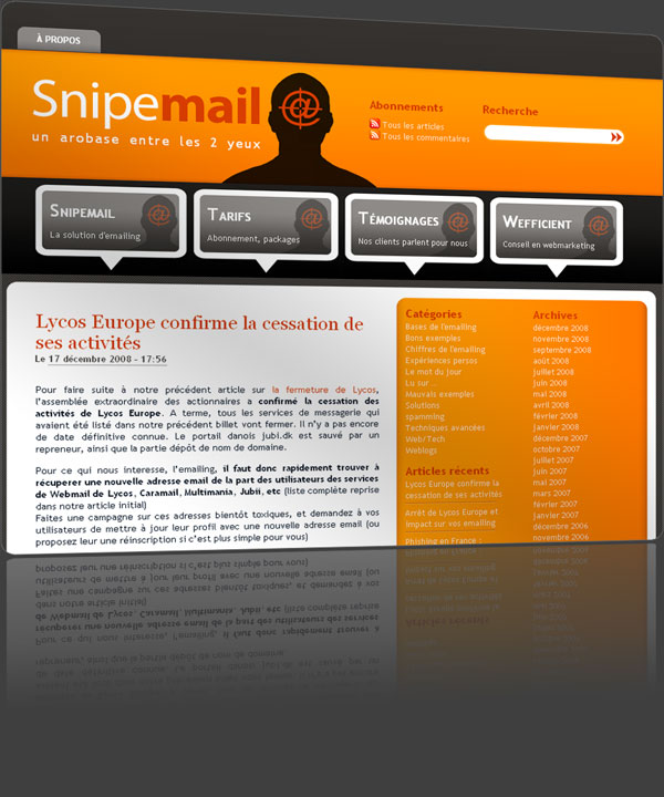 Projet : Création d’un blog professionnel Sous WordPress CMS utilisé : WordPress Migration des articles et de la structure depuis Typepad, Installation, configuration – Design Intégration html/css Adresse : http://www.snipemail.com/ Découvrez notre prestation de création de blogs
